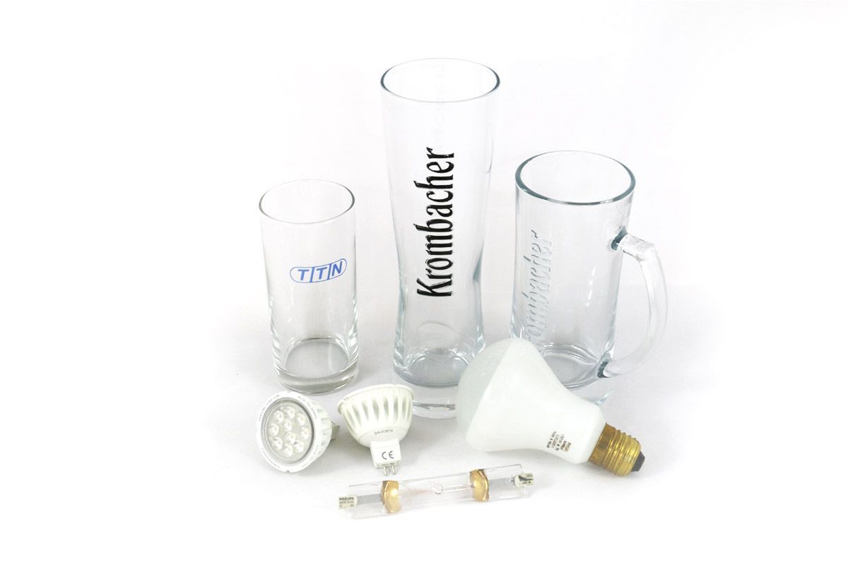 Der Tampondruck ist eine hervorragende Möglichkeit, Glas zu dekorieren. Die Tatsache, dass sich der Tampon an die Form des Substrats anpassen kann, macht den Tampondruck zu einem idealen Verfahren für das Bedrucken von runden Substraten wie z.B. Trinkgläsern oder kleinen Glasflaschen. Flaschen werden oft aus Glas hergestellt, können aber auch aus anderen Materialien bestehen, die ebenfalls bedruckt werden können. Weitere Anwendungen, bei denen Glas bedruckt wird, sind z. B. Glühbirnen, Röhrenleuchten, Brillengläser, Autoscheiben usw.